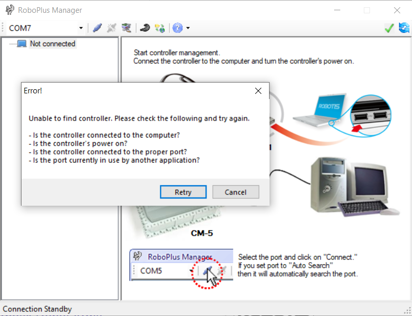 I tried to use the R+Manager and I am getting the following error. I don't have a U2D2. I am using the cable provided with the OpenCM9.04. Is there any tutorial I can follow? Can you send me the link to download R+Manager 2.0?